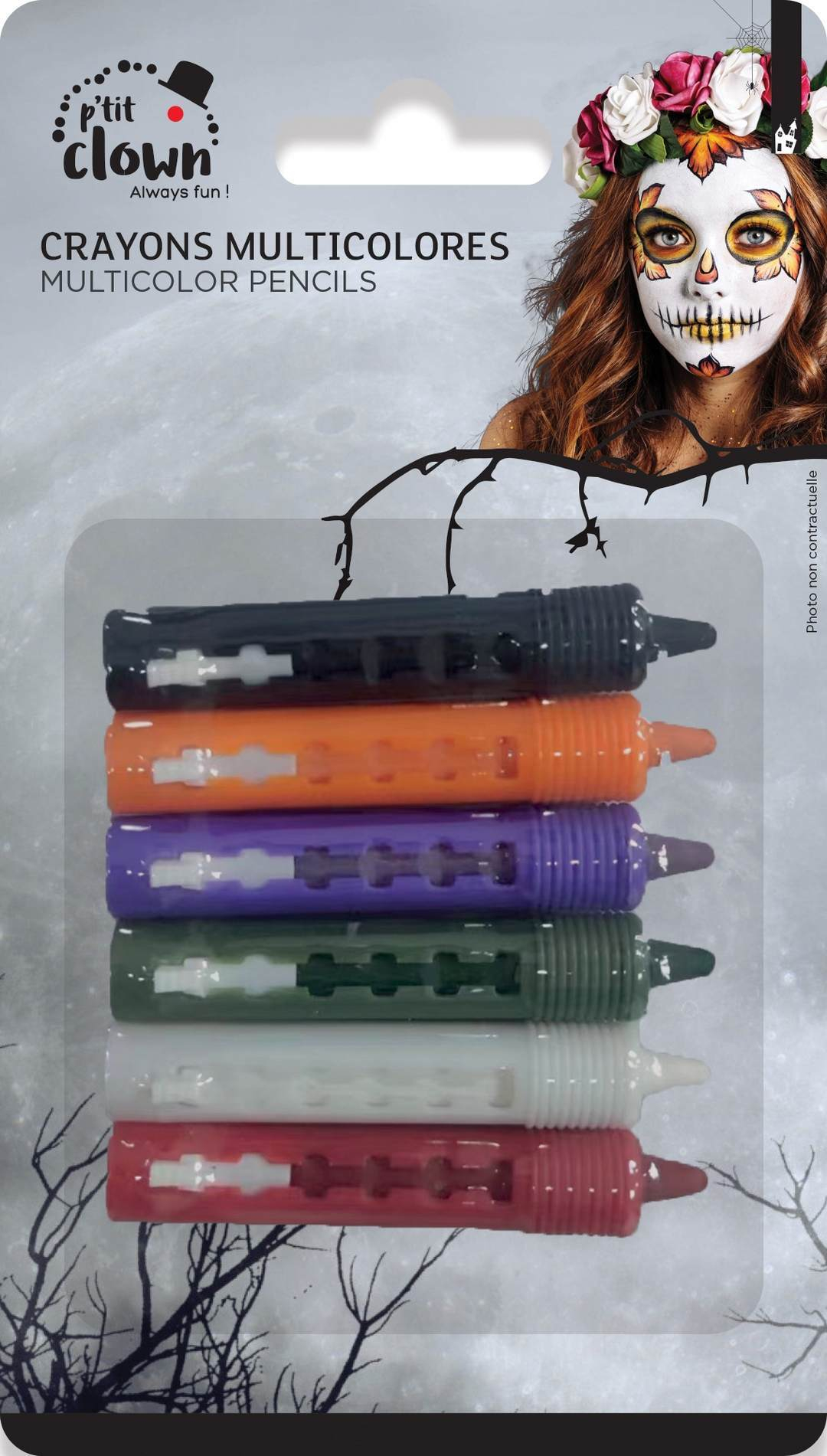 Set de 6 crayons de maquillage rétractables Ptit Clown pour Halloween, offrant une application précise et facile avec 6 couleurs vives.