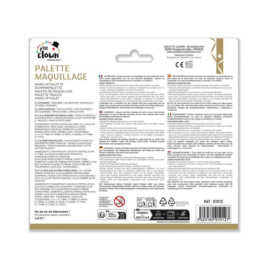 La palette de maquillage complète P'tit Clown comprend 11 fards gras, 6 crayons, 2 applicateurs et 2 éponges, idéale pour des maquillages festifs et créatifs lors de vos événements déguisés.