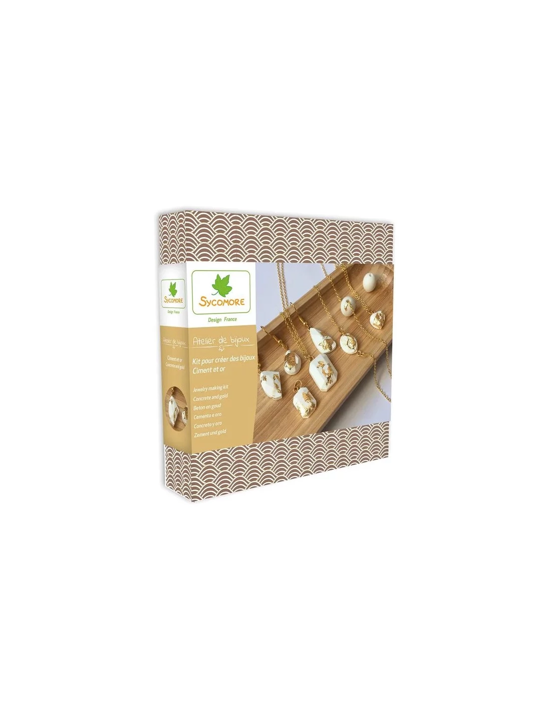 Découvrez le coffret Atelier de bijoux ciment et feuilles d'or de Sycomore, une activité créative idéale pour les enfants à partir de 10 ans. Ce kit complet permet de réaliser des bijoux uniques en combinant le ciment blanc et les feuilles d'or et de cuivre.