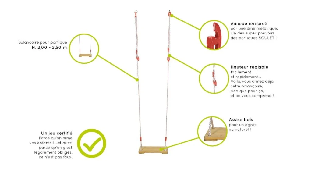 La balançoire en bois pour portique Soulet est un agrès classique et incontournable pour compléter une aire de jeux extérieure. Son assise en bois traité pour l’extérieur offre solidité, confort et résistance aux intempéries.