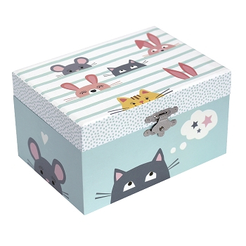 La Boîte à Musique Chat Phosphorescent de Trousselier est un coffret musical enchanteur qui brille dans le noir et joue une douce mélodie, offrant un espace de rangement pour les petits trésors de votre enfant.