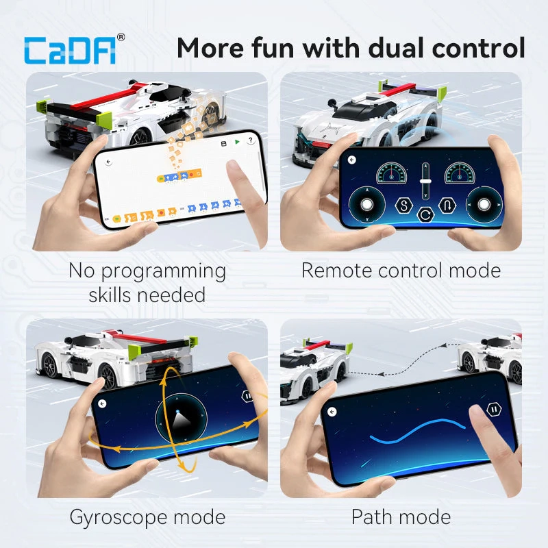 - Double mode de contrôle : Utilisez la télécommande 2,4 GHz incluse ou l'application mobile CaDA Smart (disponible sur iOS et Android) pour piloter votre voiture.