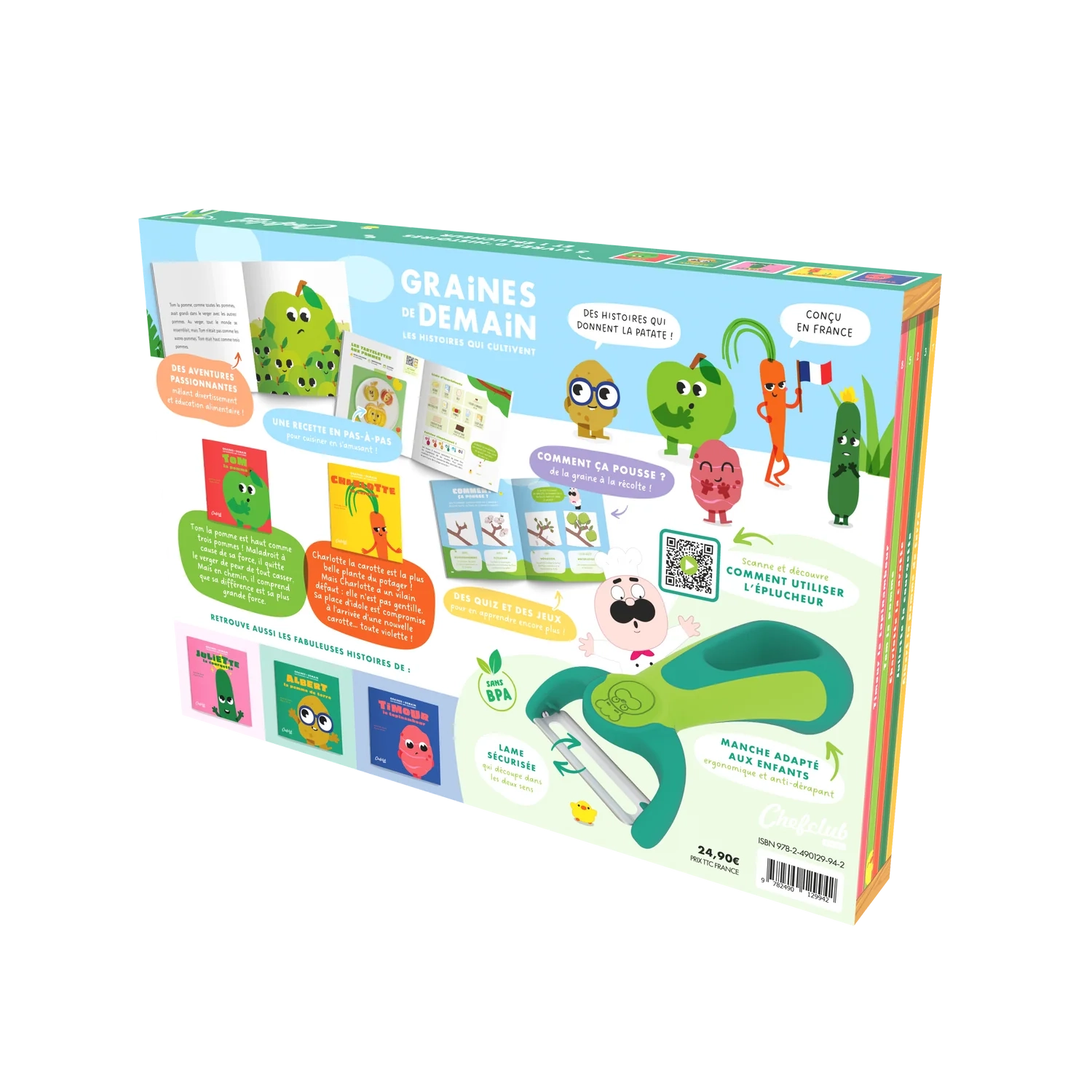 Le Coffret Graines de Demain et son éplucheur de Chefclub est une invitation ludique pour les enfants à découvrir le monde des fruits et légumes à travers des histoires captivantes et des activités culinaires adaptées.