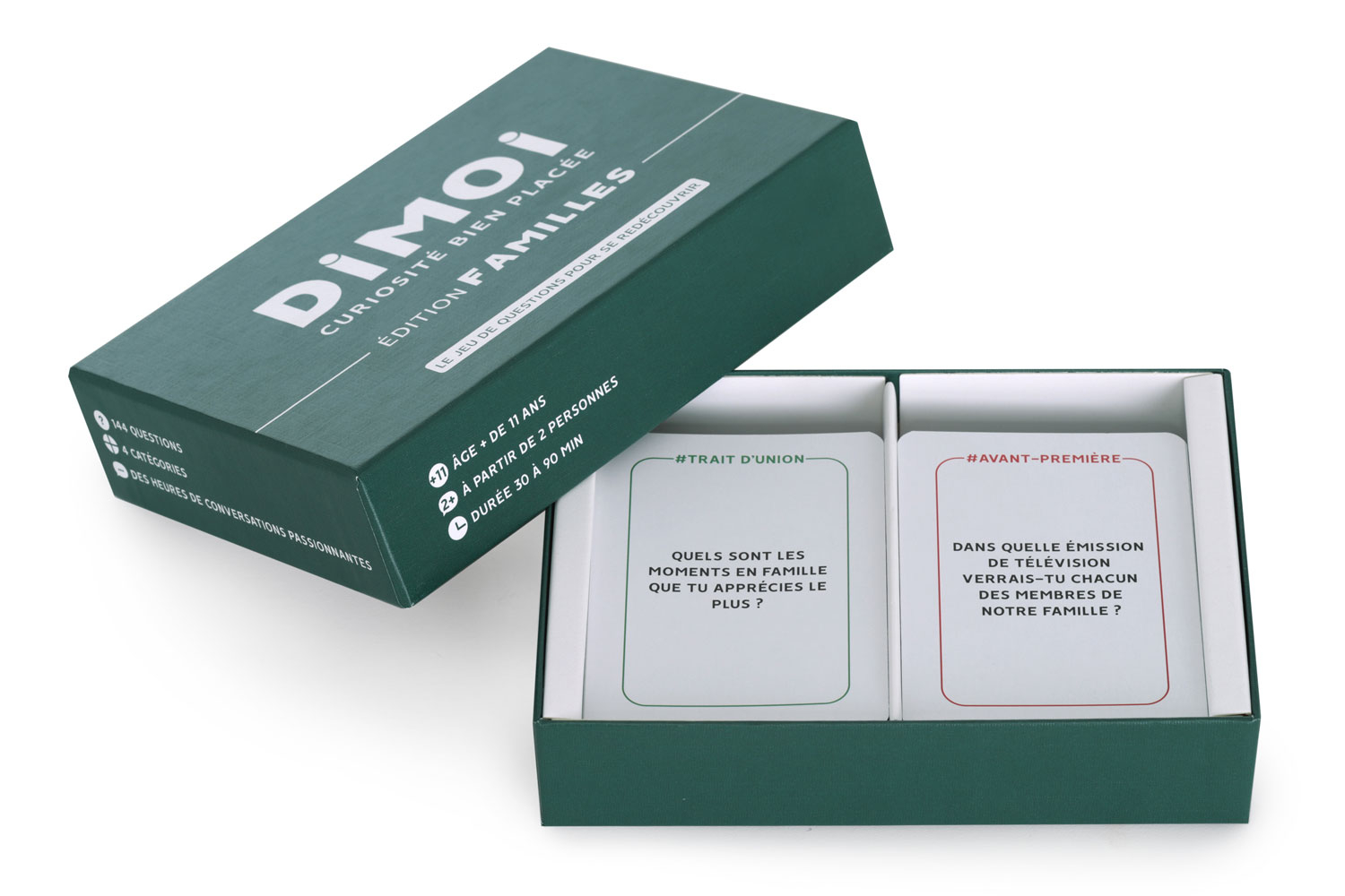 Dimoi Édition Familles est un jeu de société convivial conçu pour renforcer les liens familiaux à travers 144 questions réparties en 4 catégories inédites. Adapté pour 2 à 42 joueurs dès 11 ans, il offre des moments de partage et de découverte en famille. ([gigamic.com](https://www.gigamic.com/jeu-de-communication/819-dimoi-edition-familles-3770017095036.html?utm_source=openai))