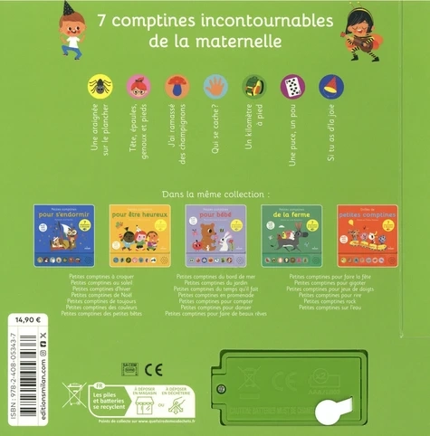 Petites comptines de la maternelle est un livre sonore interactif conçu pour les tout-petits, illustré par Lucie Brunellière. Grâce à un boîtier sonore intégré, les enfants peuvent écouter en toute autonomie sept comptines incontournables de la maternelle :