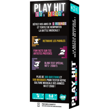 PLAY HIT - 90's 2000's est un jeu d'ambiance qui met à l'épreuve votre culture musicale des années 90 et 2000 à travers trois manches : devinez les paroles, répondez à des questions amusantes et participez à un blind test. Idéal pour 2 à 10 joueurs, dès 14 ans, pour des parties d'environ 30 minutes.