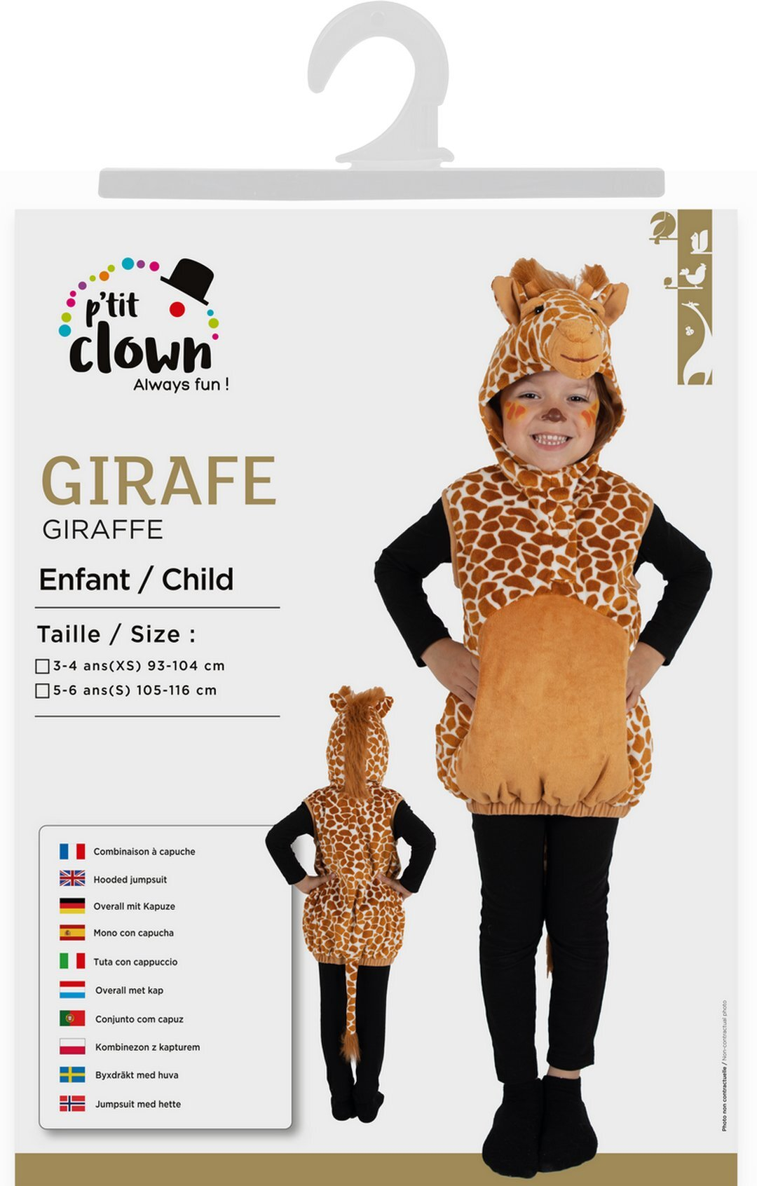 Transformez votre enfant en une adorable girafe avec ce déguisement Ptit Clown, idéal pour le carnaval ou les fêtes costumées. Conçu pour les enfants de 3 à 4 ans (92 à 104 cm), il comprend une veste à capuche en peluche douce avec motifs de girafe et une capuche représentant la tête de l'animal. Facile à enfiler grâce à sa fermeture éclair frontale, ce costume en 100% polyester assure confort et durabilité.