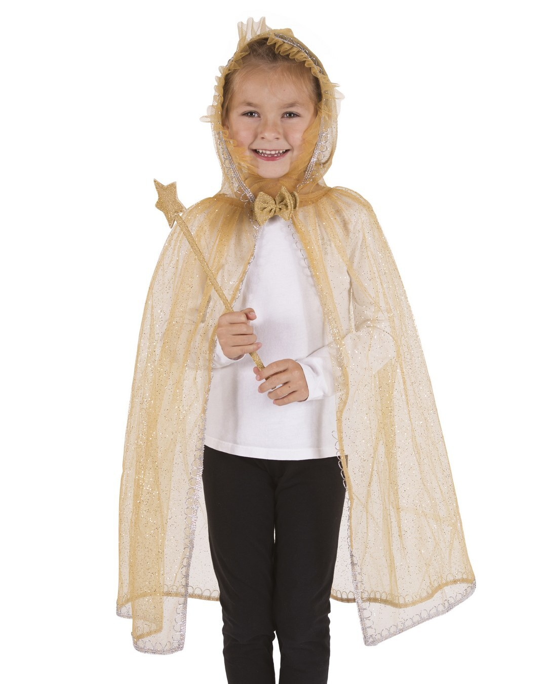 Transformez votre enfant en une véritable princesse avec le kit de déguisement or de P'tit Clown, comprenant une cape scintillante, une couronne et une baguette magique.