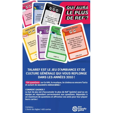 Talaref 2010 est un jeu d'ambiance et de culture générale sur le thème des années 2010. Accumulez des points en répondant aux questions et défiez vos amis pour leur subtiliser leurs cartes. Un jeu idéal pour revivre les moments forts de la décennie en famille ou entre amis.